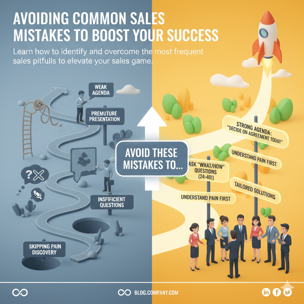 In summary, avoiding these common sales mistakes—weak agenda-setting, insufficient questioning, premature presentation, and skipping pain discovery—can significantly enhance your sales effectiveness. By implementing these actionable tips, you’ll build stronger client relationships and close more deals.