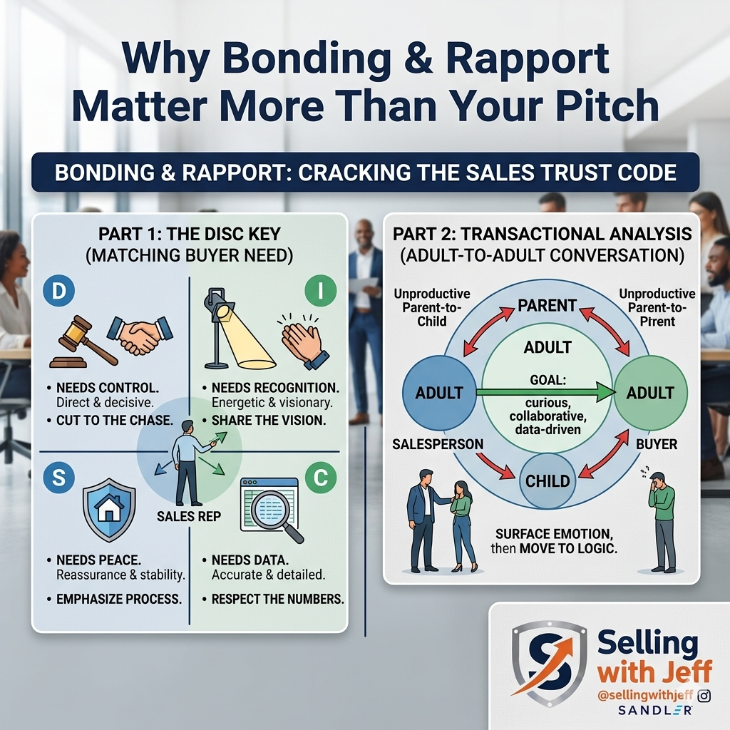 Most major purchases start in the Child ego state: “I want a bigger kitchen,” “I’m frustrated with slow sales,” “We’re tired of change orders blowing up budgets.” As Sandler content on rapport and TA highlights, people buy emotionally and justify logically. That means your first job in Bonding & Rapport is not to overwhelm the buyer’s Adult with slides—it’s to surface and validate the Child’s emotional drivers.