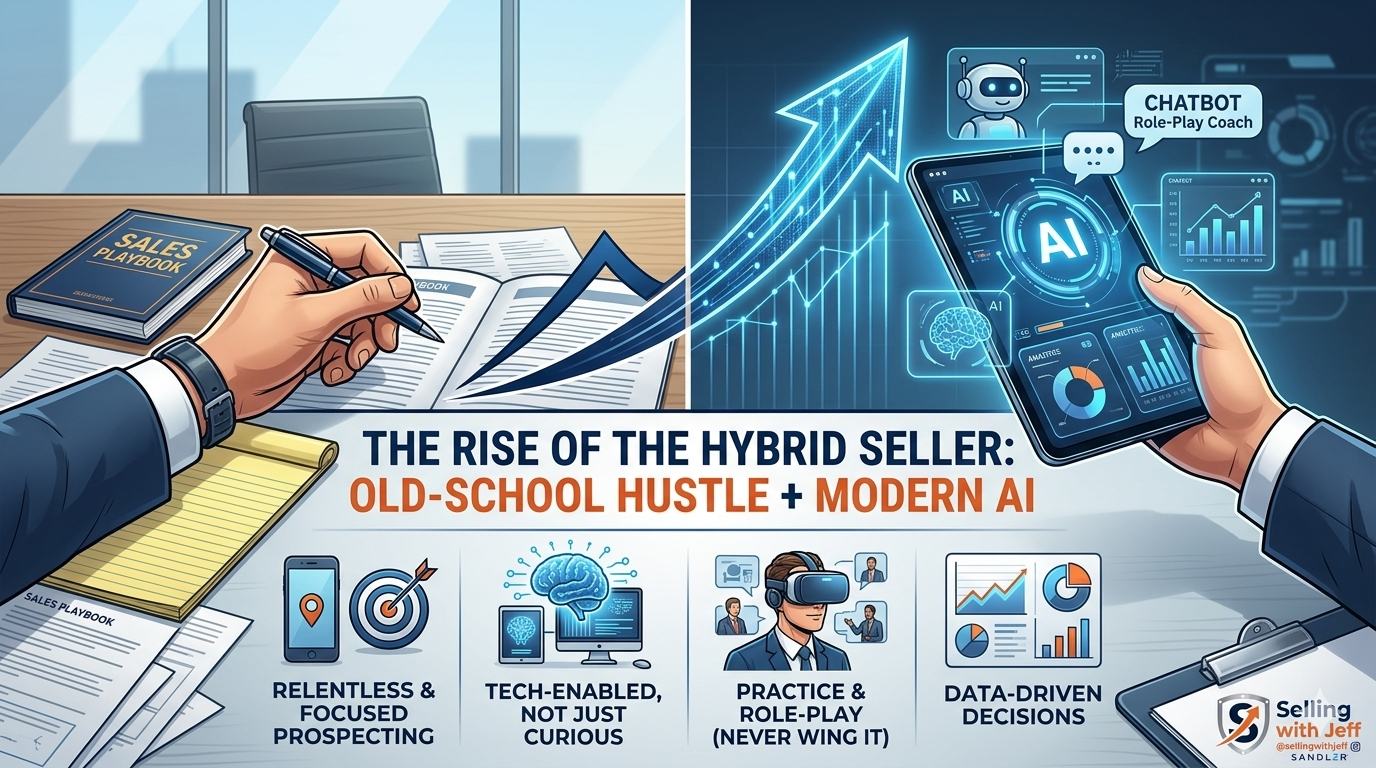 But the message isn’t “throw away your Sandler playbook.” It’s the opposite. When you add AI to weak fundamentals, technology simply exposes mediocrity faster. Hybrid sellers win because they keep the principles—bonding and rapport, pain, budget, decision, clear next steps—and use AI to apply those principles with more insight and less wasted motion.