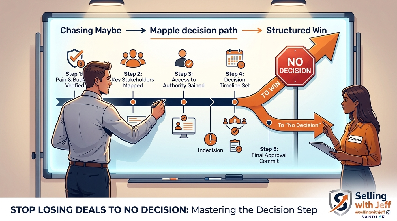 Research on complex B2B deals shows why. Modern buying committees often include eight or more stakeholders, each with different concerns, from technical feasibility to political risk. As described in Sandler’s guidance on the Decision Step, top performers slow down long enough to identify the exact decision that must be made, who owns it, and what criteria they’ll use to say yes or no (Sandler Training).