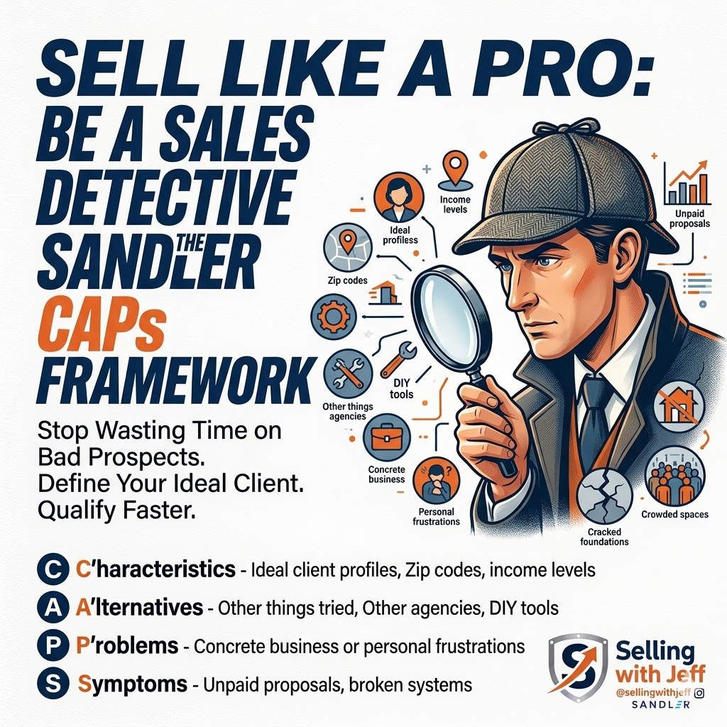 The Sandler CAPs framework helps you predict which prospects will become profitable, enjoyable clients instead of time‑wasters. CAPs stands for Characteristics, Alternatives, Problems, and Symptoms. When you define each clearly, you stop chasing anyone who can fog a mirror and focus on people who are likely to buy, buy again, and refer.