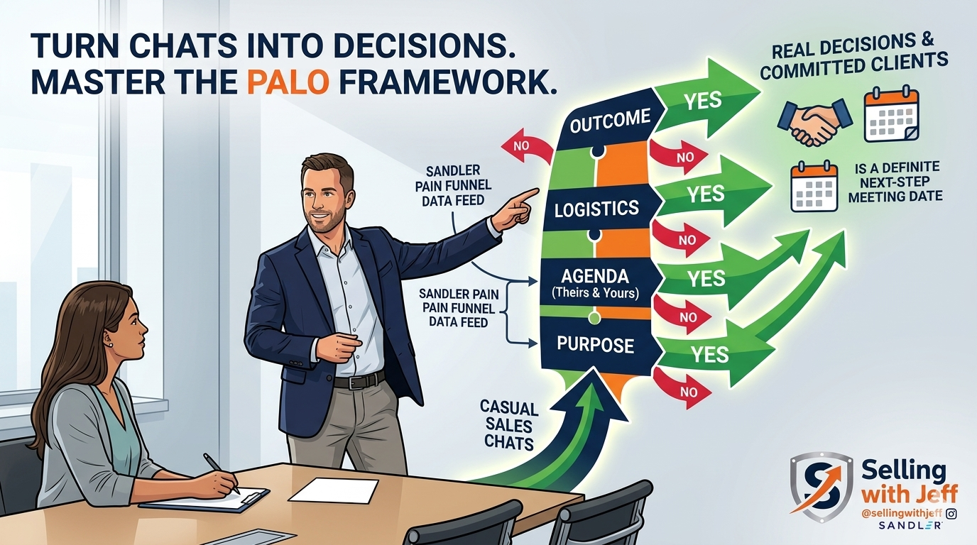 A PALO conversation starts simple: confirm purpose, explore agendas, align on logistics, and lock in outcomes. The magic comes from how you use those moments to feed the Sandler pain funnel and uncover why change, why now, and why you. Every part of PALO is built to generate questions instead of pitches.